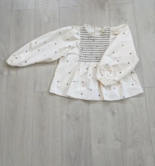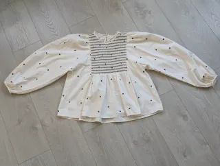 Bonita blusa de algodón con mangas abullonadas y detalle de nido de abeja. - Estampado de pequeños corazones negros. - Cuello con volante. - Mangas largas abullonadas con puño. - Un solo uso. * Tiene un pequeño desperfecto donde estaba la etiqueta. Hago envío, también se puede recoger en la calle Jaime el conquistador (28045 cerca de los metros Legazpi y Delicias).