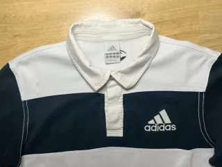 ¡Espectacular polo de rugby de Adidas con un estilo retro increíble! Es una prenda de gran gramaje, muy resistente y con detalles que marcan la diferencia. Ideal para un look oversize o streetwear. ▲ Tiene pequeña mancha en hombro derecho, mancha no visual cuando esta puesta la prenda(foto 3) Lo mejor de la prenda: Diseño: Estilo Rugby de rayas anchas (Colorblock) en blanco y negro. Detalle Trasero: Gran parche con la letra "P" y el número "16" en la espalda, con un toque desgastado muy auténtico Ⅲ. Estado: Excelente estado, muy bien conservado. El tejido es algodón de alta calidad. Talla: M