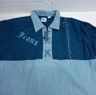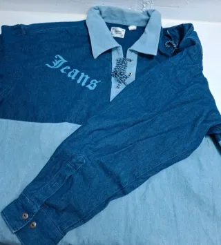 Sobrecamisa de manga larga con un diseño moderno y juvenil. Es como una camiseta de algodón de manga larga combinado con jeans vaquero fino y cuello con cordones. Muy comoda y versátil como camisa o como Jersey fino. - Dos tonos de azul denim. - Detalle de cordones en la parte frontal. - Bordado Jeans en el pecho. - Adorno de cordones en el lateral derecho.