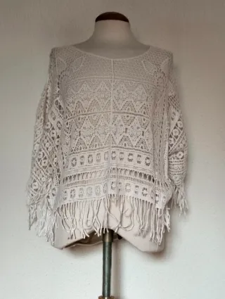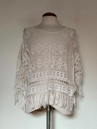 Bonita blusa de crochet en color blanco, con un diseño muy bohemio y veraniego. Es una prenda ligera y con mucho estilo. Sisa 65 Largo 50cm incluidos flecos Algodón - Diseño de crochet intrincado. - Detalle de flecos en el bajo. - Manga corta acampanada.