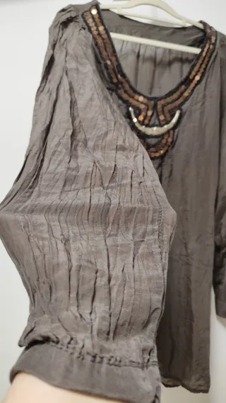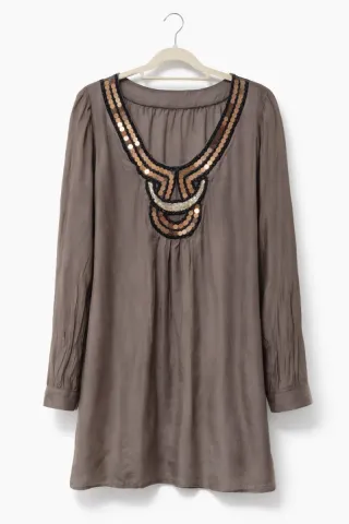 Elegante túnica estilo boho con detalles bordados en el cuello. Confeccionada en una mezcla de seda y algodón para un tacto suave y ligero. - Diseño con escote adornado con lentejuelas y abalorios. - Mangas largas con puños. - Corte holgado y cómodo.