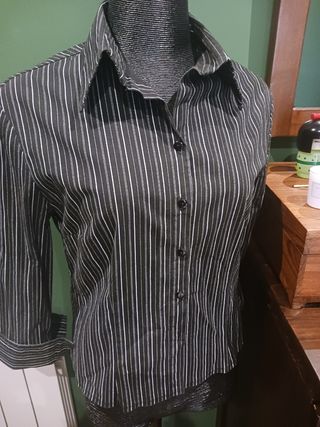 Camisa hecha a medida de rayas blancas continuas y discontinuas sobre fondo negro.Manga con bonito puño que se puede recoger. Algodón y elastan. Talla 38-40. Nueva .De hombro a hombro 44cm y de sisa a sisa 47 largo 59cm
