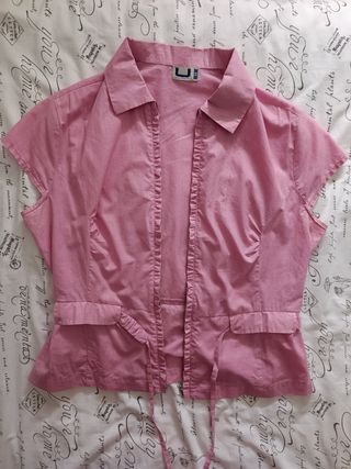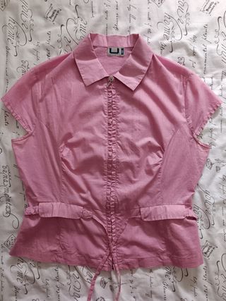 Blusa color rosa de manga corta con cremallera de Adolfo Domínguez. Muy poco usada. El material es 100% algodón. La etiqueta marca un talla 44 (en 2007), pero las medidas son las siguientes: Hombros: 41 cm Largo: 56 cm Axila: 44 cm.