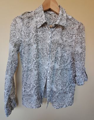 Camisa blanca y gris perla de Sud Express, con bolsillo central y manga que se recoge a tres cuartos. Con hebilla de tela en la hombrera. Muy buen estado. Talla M. 70% algodón, 30% seda Medidas: hombro 37cm, sisa 47cm, largo 58cm