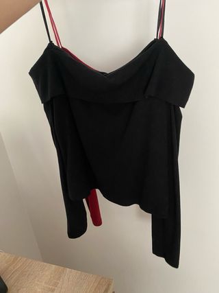 Dos camisetas iguales de algodón, sin hombros, la roja usada una vez y la negra sin usar.