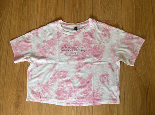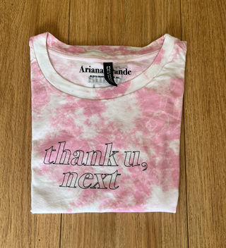 Camiseta de edicion especial colaboracion de Ariana Grande con H&M. Diseño tie-dye en tonos rosa y blanco con frase icónica “Thank u, next” en el frontal y nombre de la artista en la parte trasera. ✨ Estilo oversize/cropped ✨ Color: Rosa y blanco ✨ Marca: H&M ✨ Talla: M ✨ Medidas: Axilas 60cm / hombros 59cm / Largo 46cm ✨ Composicion: 100% algodon