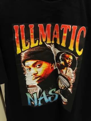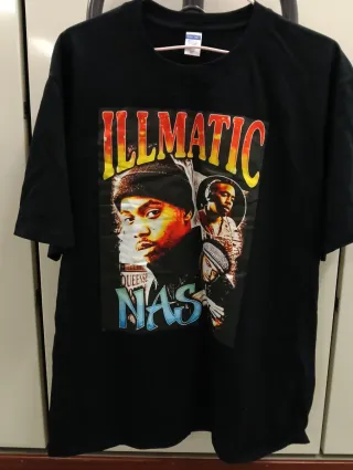 Camiseta de estilo Hip Hop con diseño de Nas y el álbum Illmatic. talla XXL 62 cm de Axila a axila y 74 cm de largo También disponible en 3XL 100% algodon - Estampado frontal. - Manga corta.