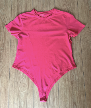 Body basico de manga corta en color fucsia. Con cuello redondo y cierre en la parte inferior. Nuevo, no se ha usado nunca. ✨ Color: Fucsia ✨ Marca: Primark ✨ Talla: XL ✨ Medidas: hombros 40cm / axilas 48cm / largo 73cm / largo manga 18cm / cadera 50cm ✨ Composicion: 95% algodon, 5% elastano