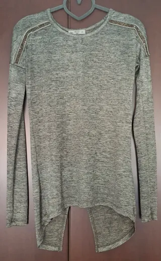 Camiseta de manga larga con detalles en los hombros. - Tejido jaspeado. - Adorno de pedrería en los hombros. - Bajo asimétrico. Espectacular camiseta en tonos verdosos con brillo y pedreria Cuello redondo de 21 cm. Costura de la manga caida. Adornos de pedrería a ambos lados del cuello de 19 cm. Tiene un original diseño, con una abertura trasera central. Tejida extremadamente suave y fino al tacto. Elastica. Excelentes acabados Costura en la parte trasera que termina con abertura en V de 26 cm. Pecho: 46 cm. Largo parte delantera: 63 cm aprox. Manga desde la costura caida de 53 cm. Excelente camiseta muy elegante