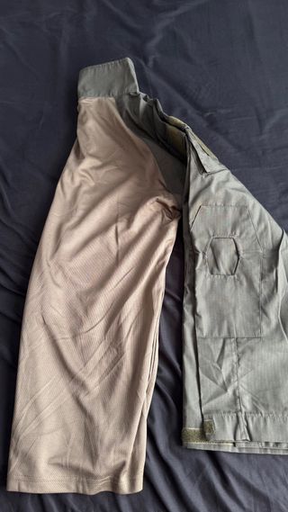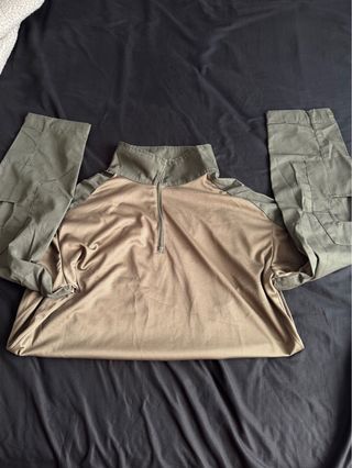 Camiseta táctica de manga larga con cuello alto y media cremallera. - Mangas de color verde. - Cuerpo central en color beige. - Cuello alto con cremallera.