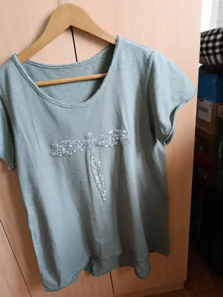 Conjunto de dos camisetas para mujer. - Camiseta con estampado de camuflaje y bolsillo. - Camiseta lisa con detalle de libélula de pedrería. - Medidas 📏: de hombro a hombro: 39 cm, largo parte delantera 65 cm, la camiseta de libélula la parte trasera es más larga 65 cm, de sisa a sisa 49 cm.