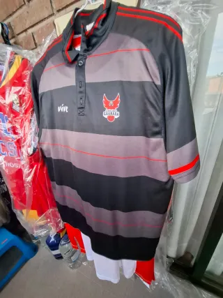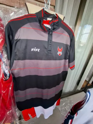 Camiseta de manga larga con diseño a rayas grises y negras, y detalles en rojo. Presenta el logo de la Fundación Granada y la palabra vive. - Diseño a rayas. - Cuello tipo polo con botones. - Logo de la Fundación Granada.