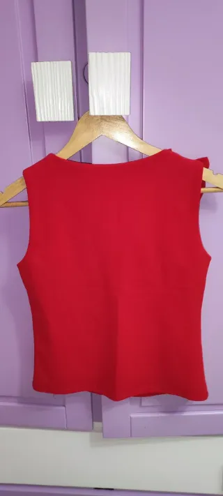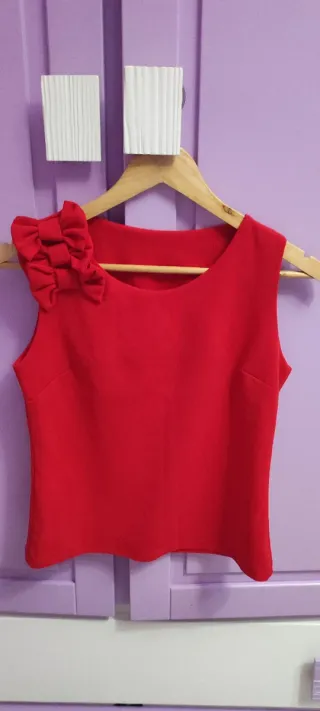 Vendo top/blusa sin mangas en color rojo con detalle de lazo en el hombro. Sirve para 34-36 (XS-S) Medidas: largo 49cm , Ancho 31cm ✅ muy buen estado ✅ Tela con buena caída ✅ Muy cómodo y bonito