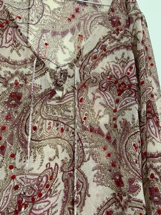 Elegante blusa con un estampado paisley en tonos beige y rojo, adornada con sutiles brillos. Presenta un escote en V con cordones para ajustar. - Diseño de manga larga. - Tejido ligero y vaporoso. - Detalle de cordones en el escote. - Estampado paisley distintivo.