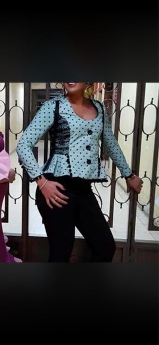 blusa color azul con encaje negro alrededor de los botones, manga muy ancha, está en perfecto Estado. Paso medidas a continuación pecho 114 cm caderas 120 cm largo delantero 72 cm largo trasero 75 cm mangas 68 cm bíceps 42 cm
