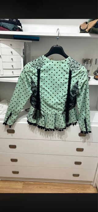 Camisa de estilo flamenco con un diseño de lunares. - Mangas largas. - Detalle de encaje en el frente. - Cierre de botones.