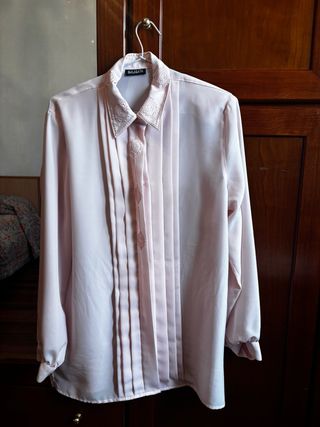 Preciosa blusa de la marca MALABATA en color rosa. - Diseño con cuello camisero. - Detalle de plisados frontales. - Adornos bordados en cuello y botones. - Mangas largas con puños.