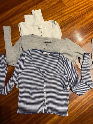 Lote de tres camisetas de manga larga, dos de Lefties y una de Mango. - Camiseta blanca de Lefties. - Camiseta gris de Lefties. - Camiseta de rayas azules y blancas de Mango Teen.