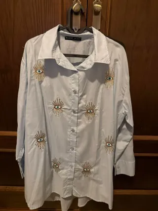 Camisa de manga larga en tono azul claro con un diseño llamativo. - Bordado de ojos con detalles dorados y lentejuelas. - Cuello camisero. - Cierre de botones al frente.