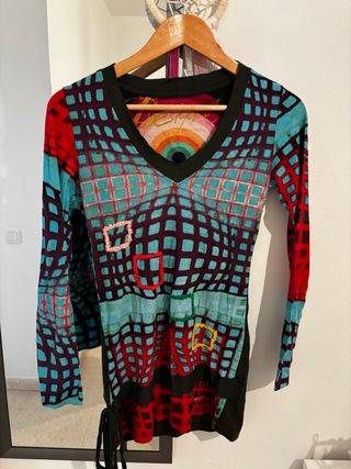 Camiseta de manga larga con un diseño vibrante y original. - Cuello en V. - Estampado geométrico y de cuadros. - Detalles bordados. - Lazos laterales para ajustar.