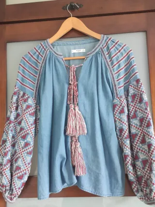 Blusa de estilo boho con detalles bordados. - Mangas largas abullonadas con bordados geométricos. - Cuello con cierre cordones y borlas. - Tejido vaquero ligero.