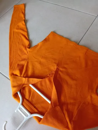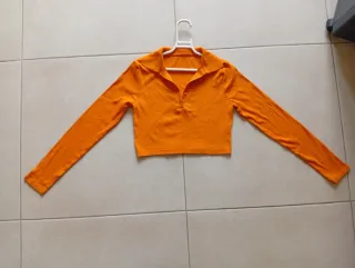 Elegante camisa satinada de manga larga. - Color naranja vibrante. - Tejido satinado brillante. - Diseño cropped con cintura marcada. - Cuello camisero y cierre de botones.