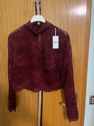 Elegante top de encaje con cuello alto y manga larga. - Diseño de encaje floral. - Corte cropped. - Cierre en la parte trasera.