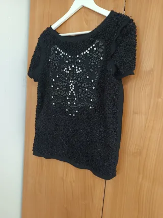 Elegante blusa de Zara con un diseño texturizado y detalles brillantes. - Tejido principal con relieve. - Adornos de pedrería y lentejuelas en el frontal. - Manga corta. Medidas largo 63 cm medidas de axila a axila 50 cm medidas de hombro a hombro 40 cm. Como nueva puesta en una ocasión