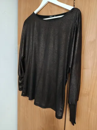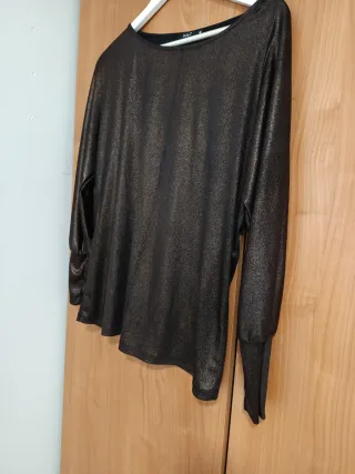 Elegante blusa con un acabado brillante, perfecta para ocasiones especiales. - Diseño con manga larga. - Corte asimétrico en el bajo. Medidas largo 66 cm medidas de axila a axila 54 cm medidas de hombro a hombro 42 cm. Como nueva puesta en 2 ocasiones