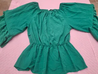 En perfecto estado. Verde. Con goma en el escote que permite usarlo tanto en forma cuadrada como con los hombros descubiertos; gomita en la cintura; manga ranglan acampanada que termina con volante de 10 cm de ancho. Medidas: Sisa tal y como se ve en las fotos 47 cm, pero llega hasta 52 al dar de sí la gomita de la cintura; contorno de cintura 60 que puede llegar a 100- 102; Largo manga 40 cm