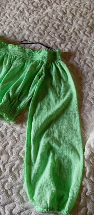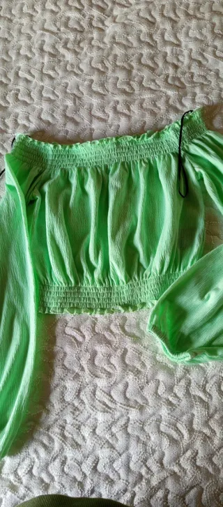 Camisa crop con diseño de hombros descubiertos y mangas largas. El tejido es ligero y con textura. - Escote elástico. - Puños elásticos en las mangas. - Detalle fruncido en el escote y bajo.. La camisa está como nueva
