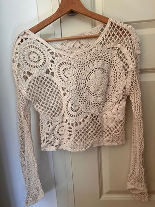 Precioso top de crochet de Zara, con un diseño intrincado y bohemio. - Elaborado con hilo de algodón. - Manga larga. - Diseño calado con motivos circulares.