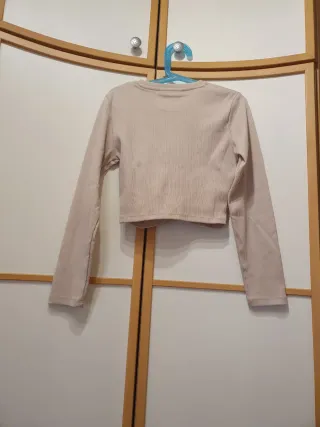 Camiseta/ Top de manga larga para niña de 10-12 años con un diseño cruzado y cortes en la zona del abdomen. El tejido es acanalado, lo que le da una textura interesante. - Diseño cruzado frontal. - Manga larga. - Tejido acanalado. Vendo en zona Barcelona y alrededores