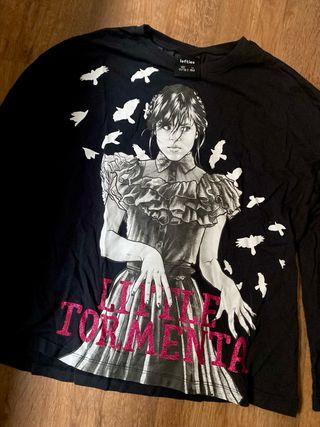 Camiseta de manga larga con un diseño llamativo. - Talla 11/12 - Ilustración central de una figura femenina rodeada de pájaros. - Detalle de texto brillante en la parte inferior. - Cuello redondo.