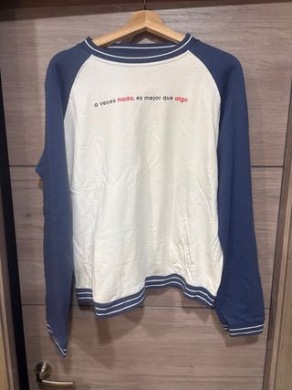 Camiseta de manga larga con diseño raglán. - Cuerpo principal en color blanco. - Mangas y cuello en color azul marino. - Detalle de ribetes en puños y bajo. - Inscripción a veces nada, es mejor que algo en el pecho.