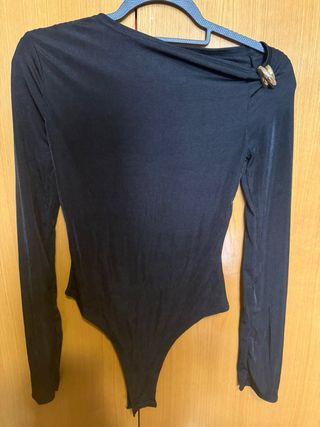 Elegante body negro de manga larga con un toque sofisticado. - Diseño asimétrico con un hombro al descubierto. - Detalle metálico dorado en el hombro. - Tejido suave y elástico.