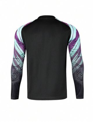 Camiseta de manga larga con diseño llamativo en las mangas. Protección de los codos. Tengo 2 camisetas si te llevas las 2, el precio es de 10 euros. Se vende porque se dejó el futbol. - Cuello redondo. - Logo en relieve en el pecho. - Mangas con estampado degradado en morado y turquesa.