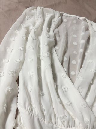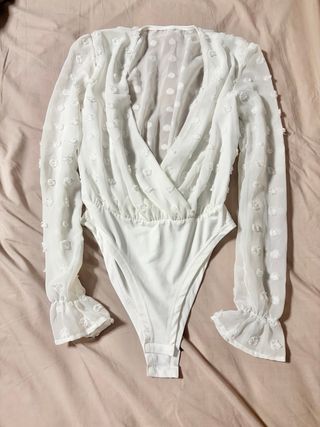 Body elegante de manga larga con un diseño delicado. - Tejido transparente con detalles de puntos. - Escote cruzado. - Mangas abullonadas con volantes en los puños. - Cierre de corchetes en la parte inferior.