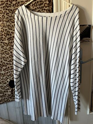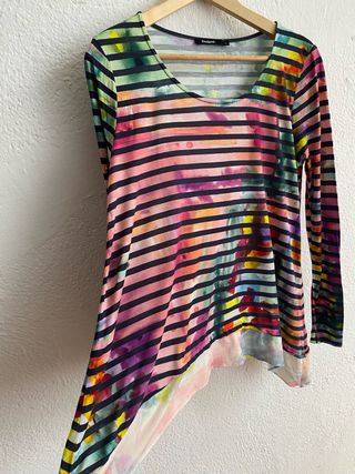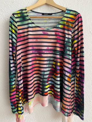 Camiseta de manga larga con un diseño vibrante y original. - Estampado a rayas con detalles de acuarela. - Corte asimétrico en el bajo. - Tejido suave y cómodo. En la parte baja se ha descosido un pequeño pespunte, pero no afecta a su uso