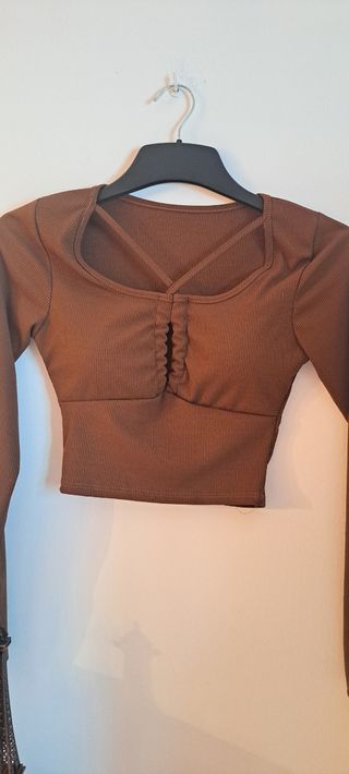 Camiseta de manga larga con un diseño moderno y favorecedor. - Tejido acanalado. - Escote cuadrado con detalle cruzado. - Fruncido en la parte delantera. - Talla unica XS/S