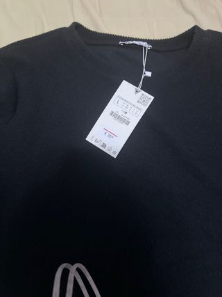Camiseta negra de Zara con un diseño asimétrico y detalles brillantes. - Corte moderno y favorecedor. - Adorno de pedrería en el bajo. - Tacto suave y agradable.