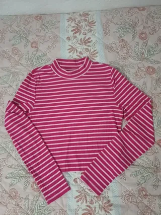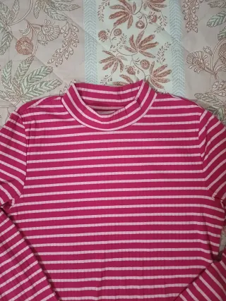 Camiseta de manga larga con cuello alto y estampado de rayas. - Diseño de rayas finas. - Tejido elástico y cómodo. Talla M, en perfecto estado.