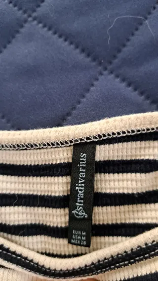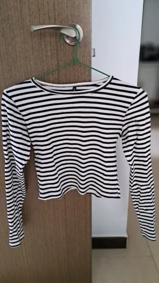 Polo de manga larga con un diseño de rayas clásico. Talla M de Stradivarius, colores blanco y negro - Cuello blanco. - Puños y bajo con acabado. - Abertura en el cuello. En perfectas condiciones 😊