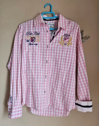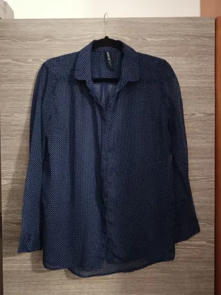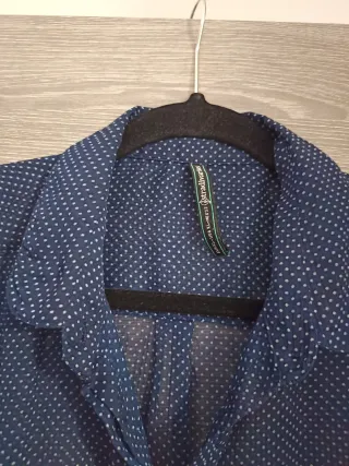 Camisa de manga larga con un diseño de topos blancos sobre fondo azul marino. - Diseño de puntos blancos. - Cuello camisero. - Cierre de botones. En perfecto estado, no dudes en preguntar 😊