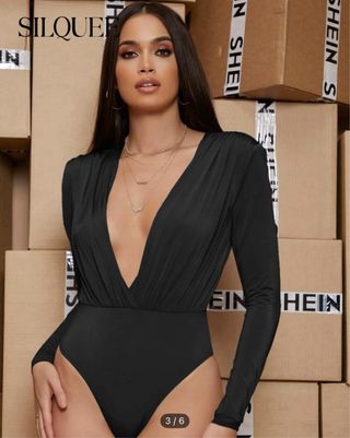 Body elegante de manga larga con un pronunciado escote en V. El diseño drapeado en el torso añade un toque sofisticado. - Tejido suave y elástico. - Mangas largas ajustadas. - Corte de body. - Diseño drapeado en el busto.