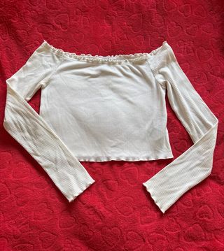Top blanco de manga larga con escote Bardot. - Tejido acanalado. - Escote elástico con volante. - Puños y bajo con volante.