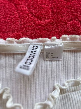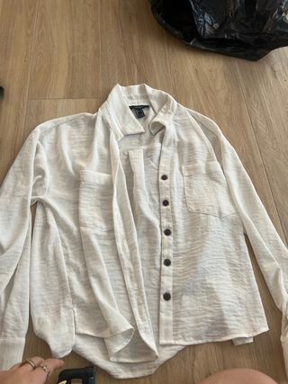 Blusa blanca tipo top de Stradivarius. Tall pequeña como si fuese una S. - Diseño con escote en pico. - Cierre de botones en la parte frontal. - Mangas largas. - Bajo con acabado deshilachado.