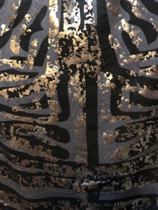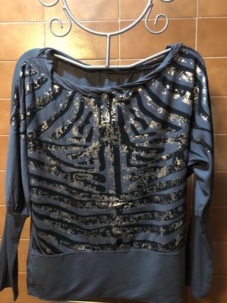 Camiseta elegante con manga larga y un diseño llamativo. - Tejido elástico para mayor comodidad. - Estampado abstracto en tonos dorados y grises. Muy buen estado. Talla 38