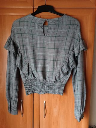 Blusa manga larga con un diseño a cuadros, detalle de volantes en los laterales, botón forrado en los puños, cintura elástica fruncida, cierre en la parte trasera del cuello. Muy buena. Bershka. Talla S