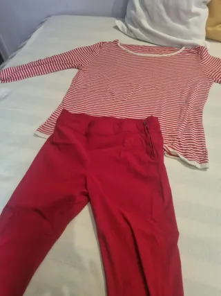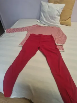 Conjunto de camiseta de rayas rojas y blancas y pantalón rojo. - Camiseta de manga larga. - Pantalón largo.
